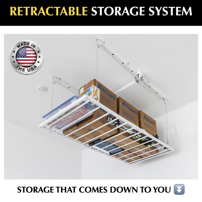 Maximize your garage space with the 4’X8′ E-Z Lift, the ultimate retractable ceiling storage solution. Designed to handle heavy loads, this compact yet powerful lift holds up to 700 lbs of distributed weight, making it perfect for storing seasonal items, tools, totes, and more. With a smooth, drill-powered operation, the 4’X8’ E-Z Lift lowers up to 8 feet, accommodating 8’–11′ ceilings with ease. When you’re done, simply raise it back to the ceiling to keep your garage floor clear and organized.