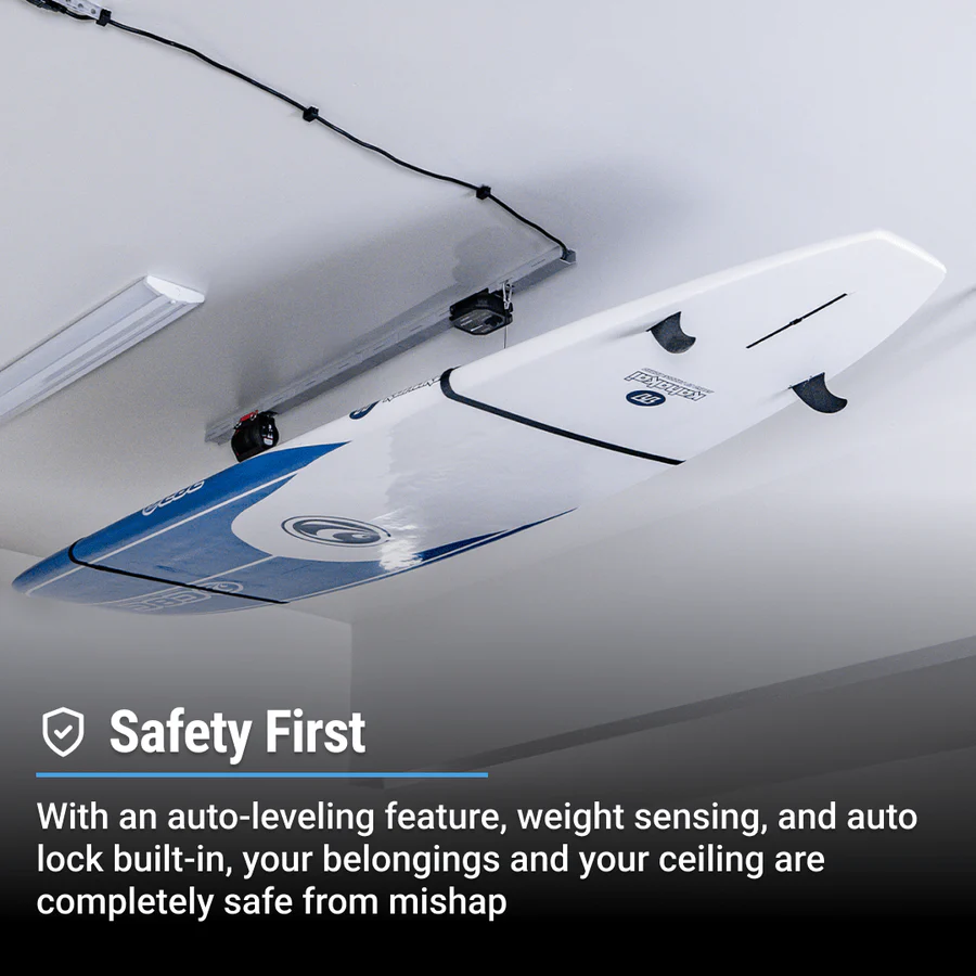 The SmarterHome Universal XL Lifter is the ultimate solution for effortless overhead storage in your garage, shed, or workshop. This powerful, versatile lift is designed to handle large, bulky, and heavy items with ease, helping you maximize your space and eliminate clutter. Say goodbye to struggling with ladders and straining your back—our motorized lift does the heavy lifting for you, transforming your garage into an organized and functional area.